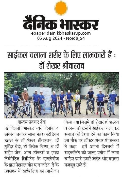 नई दिल्‍ली। भास्कर ब्यूरो दिनांक 4 अगस्त जवाहर लाल नेहरू स्टेडियम उड़अ के डॉ शेखर श्रीवास्तव, डॉ गुरिंदर बेदी, डॉ विवेक चिम्पा, व डॉ. संदीप जैन, अन्य डॉक्टर्स व इप्का लेबोरेट्रिज लिमिटेड के एम्प्लोयीज के द्वारा नेशनल बोन एन्ड जॉइंट डे के उपलक्ष्य में साईकलिंग का आयोजन किया गया जिसमे डॉ शेखर श्रीवास्तव व अन्य डॉक्टर्स ने साईकल चला कर समाज कों प्रेरणा देने का काम किया इस मौके पर डॉक्टर शेखर श्रीवास्तव ने कहा हमें अपनी दिनचर्या में साइकलिंग को जरूर प्रयोग में लाना चाहिए इससे हमारे जॉइंट और मसल्स मजबूत रहते हैं।